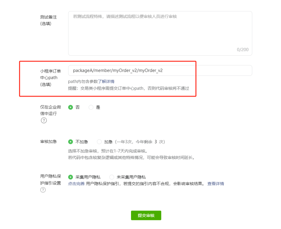 路径一:新注册或有更新需求的小程序,在小程序平台 -- 版本管理 -- 提交审核,在代码提审环节设置订单中心path,填写: packageA/member/myOrder_v2/myOrder_v2