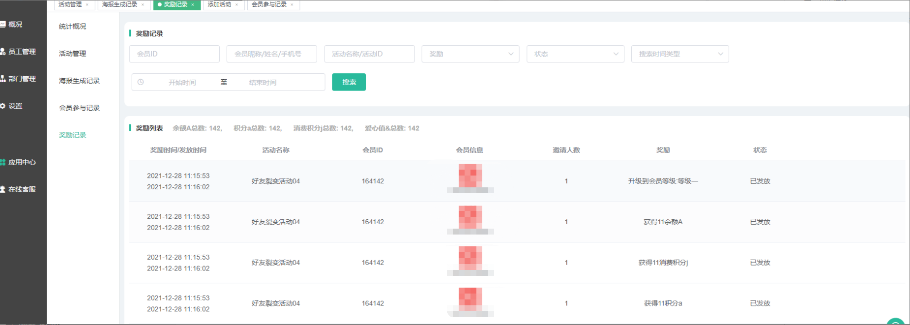 奖励设置:支持奖励积分、余额、消费积分、爱心值、升级到指定的会员等级、优惠券等。